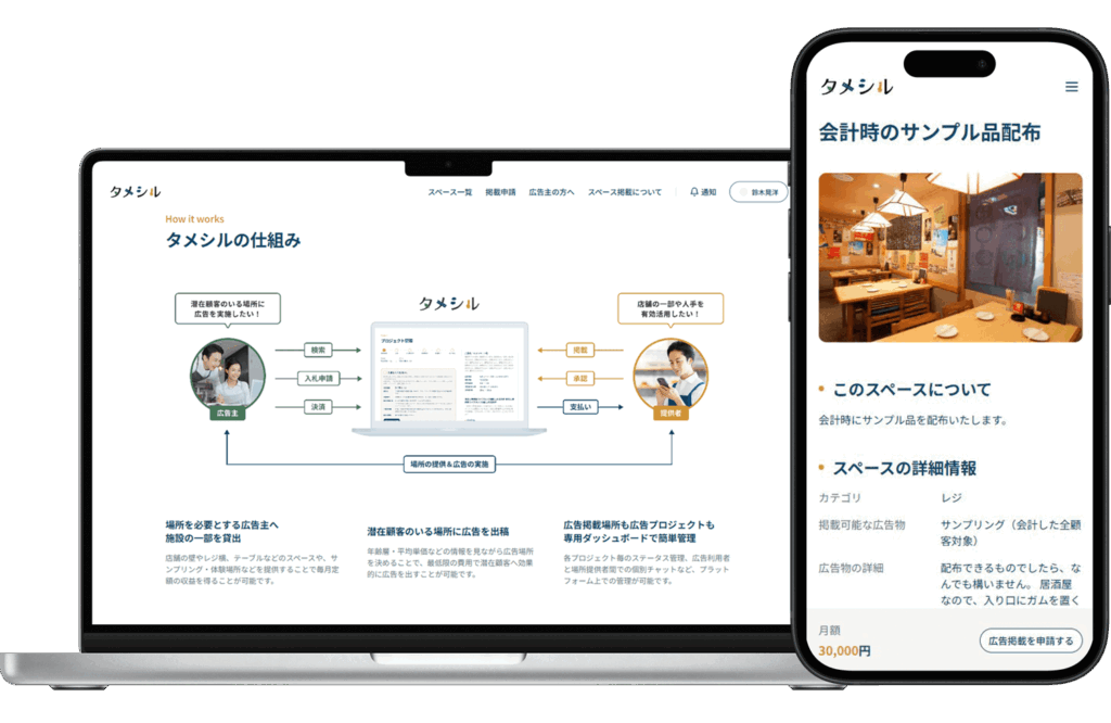 「広告」を行いたい「広告主」は、希望の場所を選び、 「店舗の一部」を貸し出す「提供者」は、指定の広告を行い収益を獲得することができるプラットフォーム。