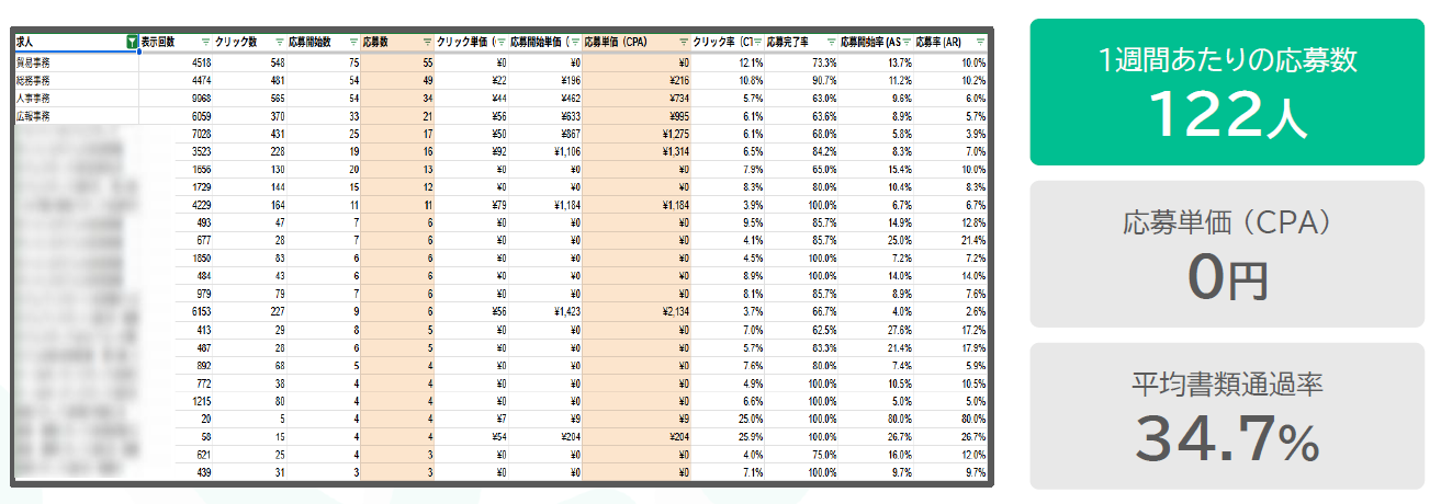 当社は、【日本一】低コストで求職者を集め応募単価を抑える自信があり、 平均応募単価1,242円・月間1,400名の応募を獲得しております。